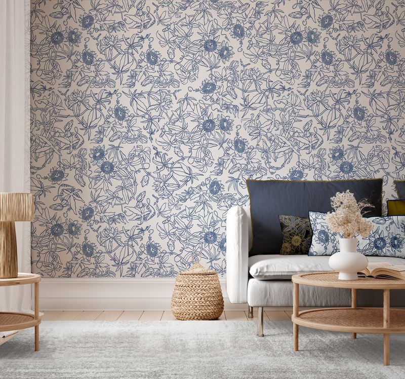 Le motif Passiflore présente une élégante interprétation florale qui capture la beauté complexe de la nature. Ses lignes délicates et sinueuses dessinent des fleurs de passiflore entrelacées, mettant en valeur des détails raffinés et une sensation de mouvement organique. Capturant les fines arabesques de cette plante grimpante emblématique, ce dessin est réalisé dans une subtile harmonie de bleu sur un fond blanc doux.
