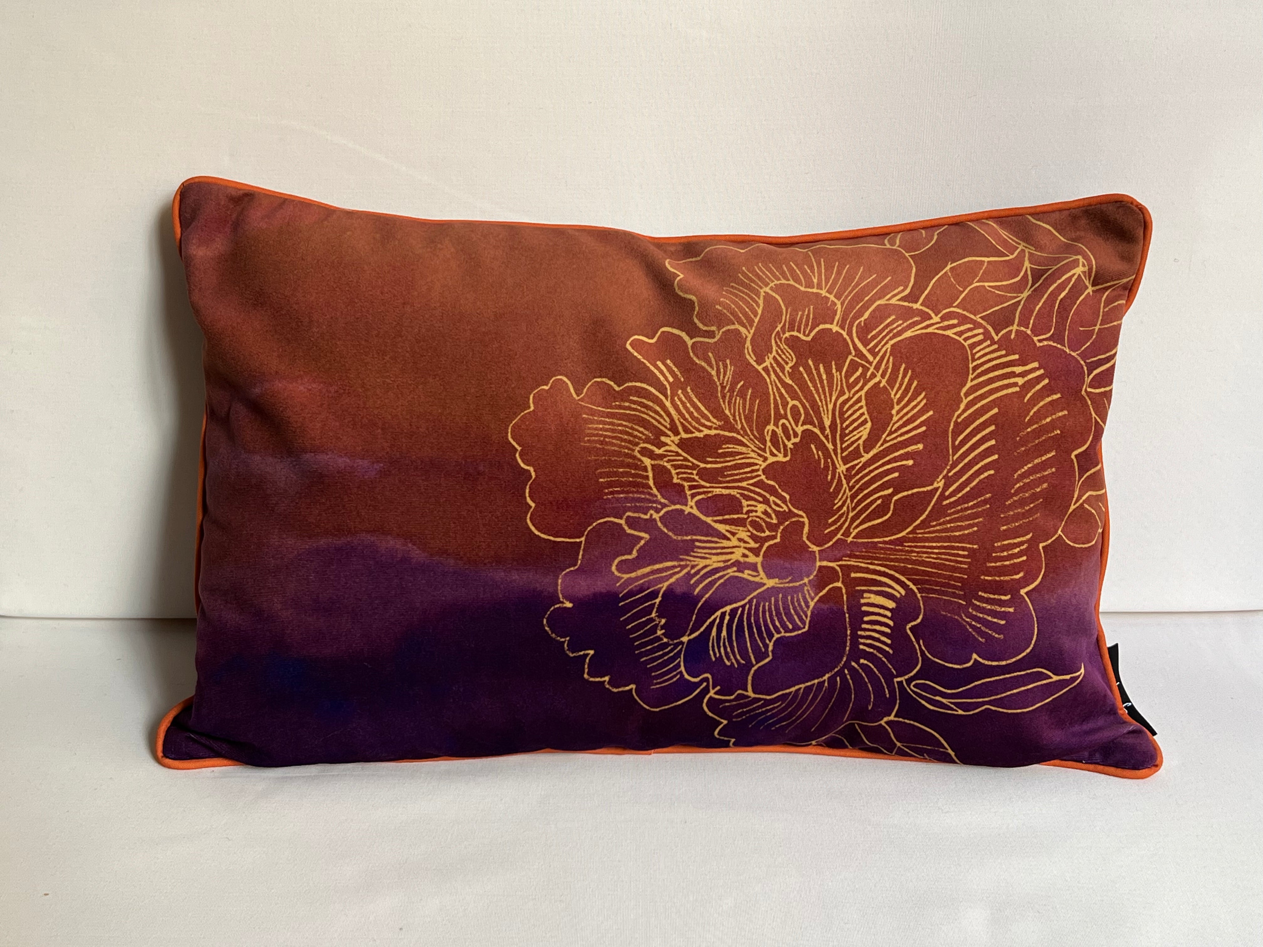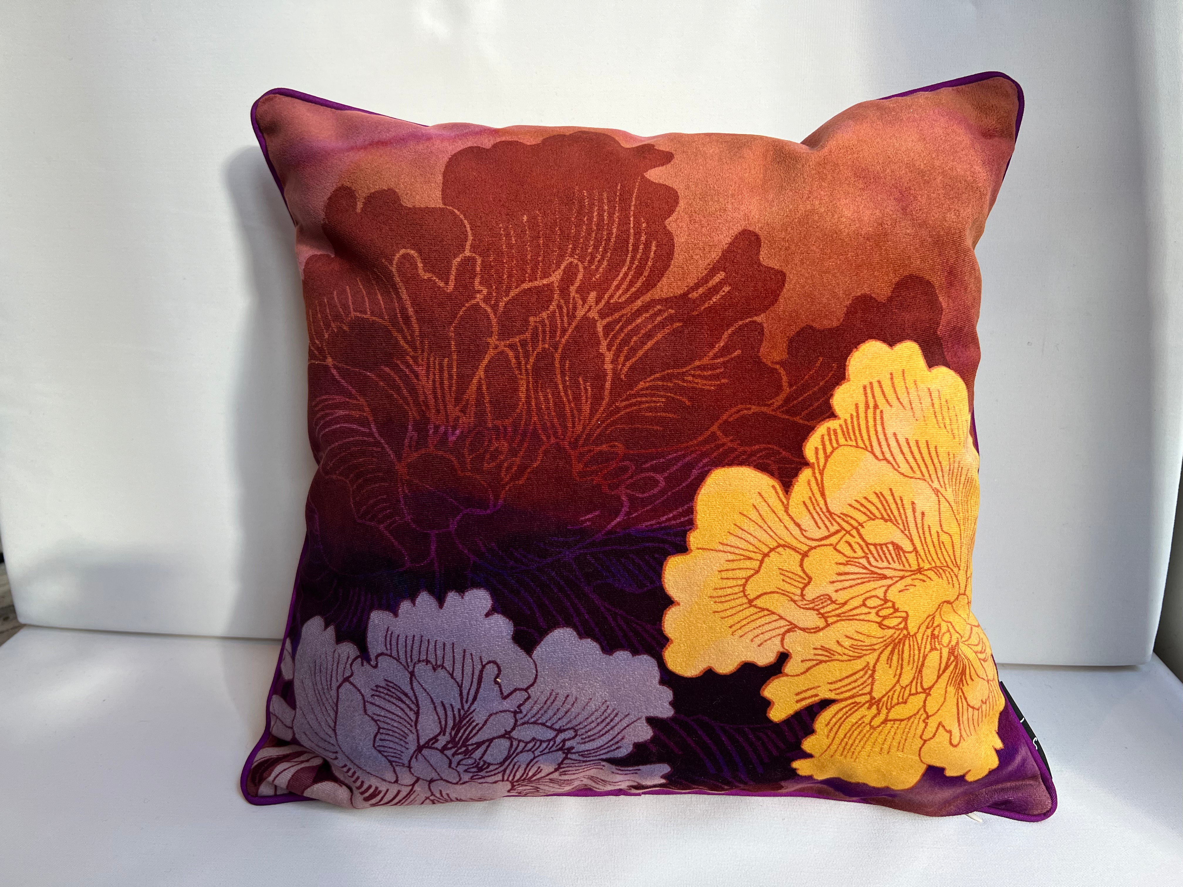 Le coussin motif Blossom présente de grandes fleurs luxuriantes aux nuances vibrantes de violet et de jaune. Les fleurs, aux contours délicatement tracés, semblent flotter sur un fond dégradé allant du rose tendre au violet profond, créant une atmosphère à la fois chaleureuse et envoûtante.
