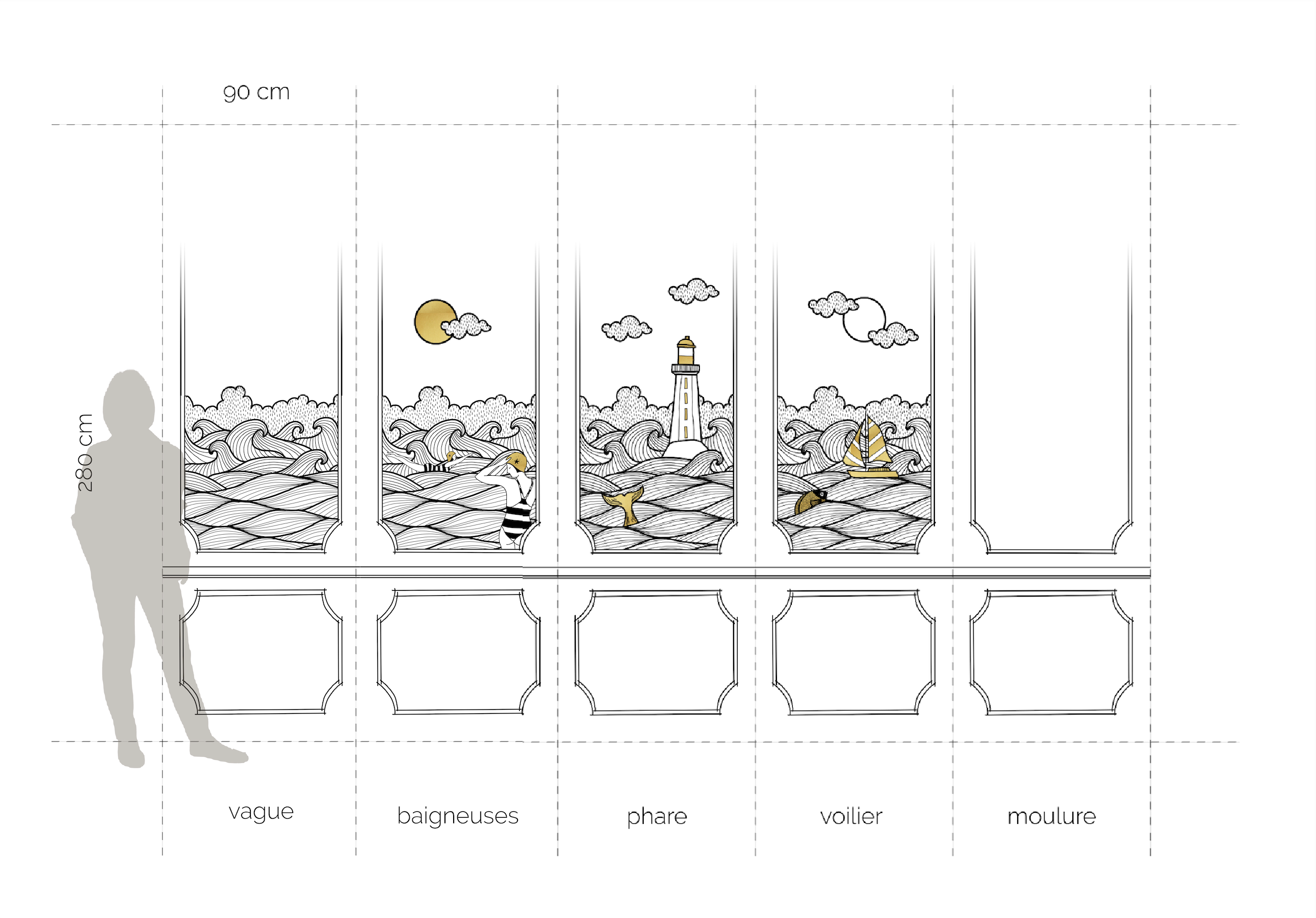 Le papier peint motif Baigneuses vous invite à un voyage poétique en bord de mer. À travers une série de fenêtres imaginaires, cette fresque illustre un paysage maritime captivant où des vagues stylisées se déploient avec élégance. Les éléments iconiques du littoral, un phare majestueux, un voilier à l'horizon, et une nageuse contemplative apportent un équilibre harmonieux entre l’immensité de l’océan et des détails subtils.