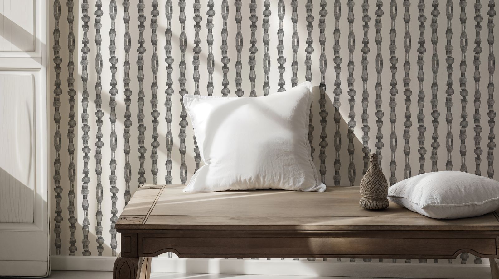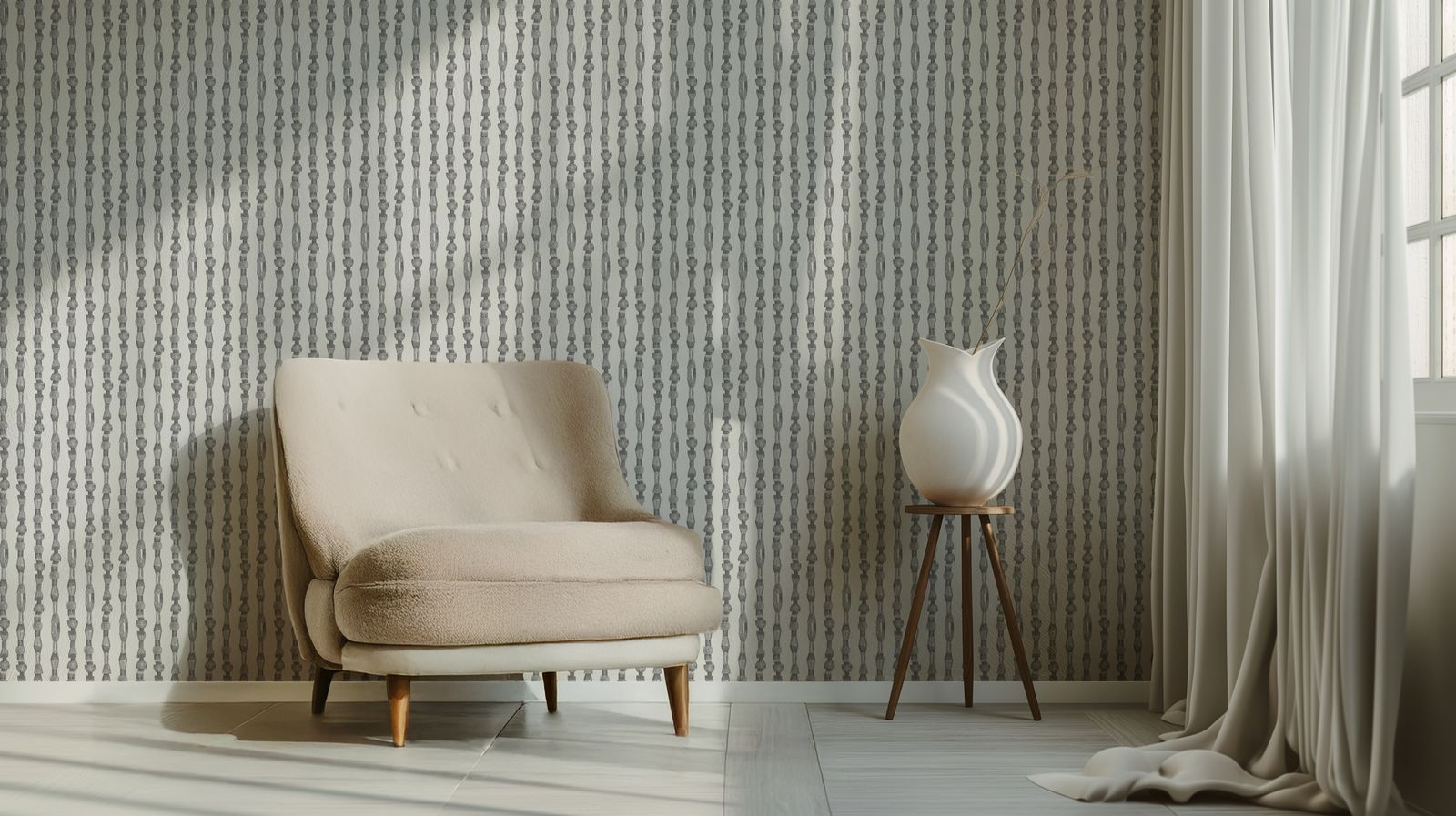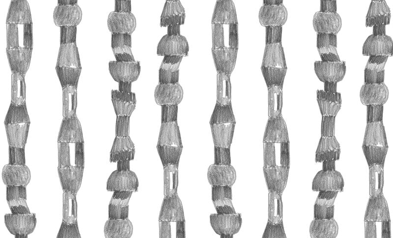 Le papier peint motif Parure se compose de colonnes verticales faites de segments géométriques irréguliers, évoquant des chaînes articulées. Les formes, dessinées au crayon en nuances de gris, varient entre des éléments arrondis et anguleux, avec des ombrages subtils qui apportent un effet de relief et de profondeur. Ce motif rappelle des parures ou des assemblages modulaires, combinant une esthétique brute et élégante.
