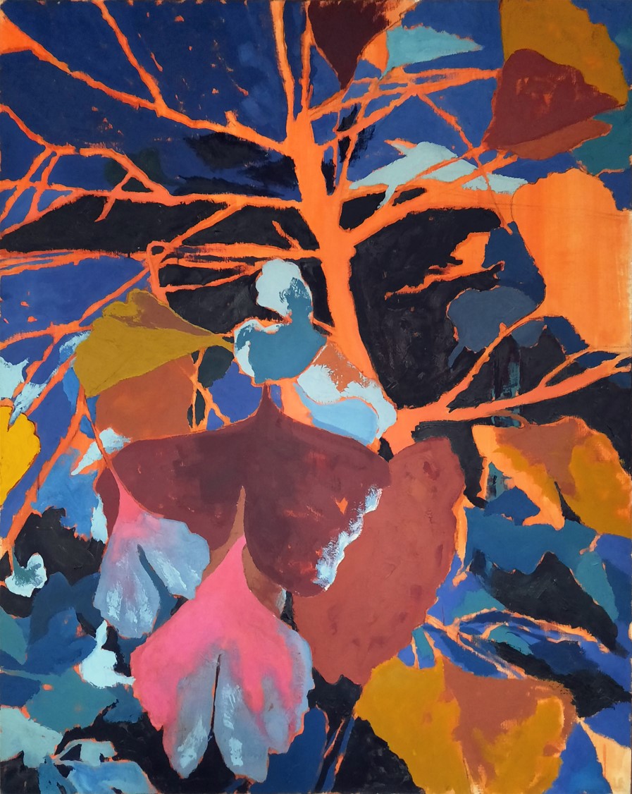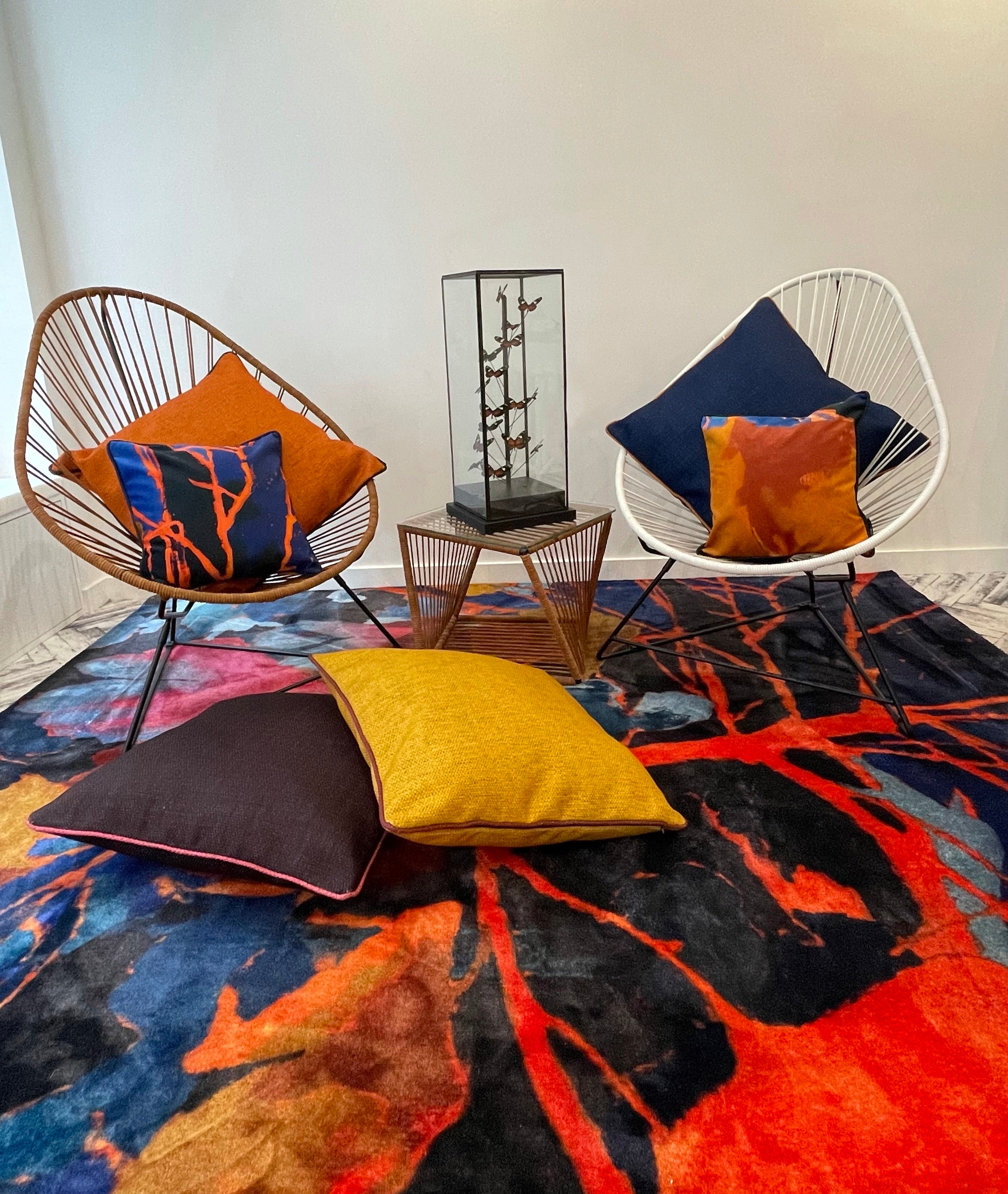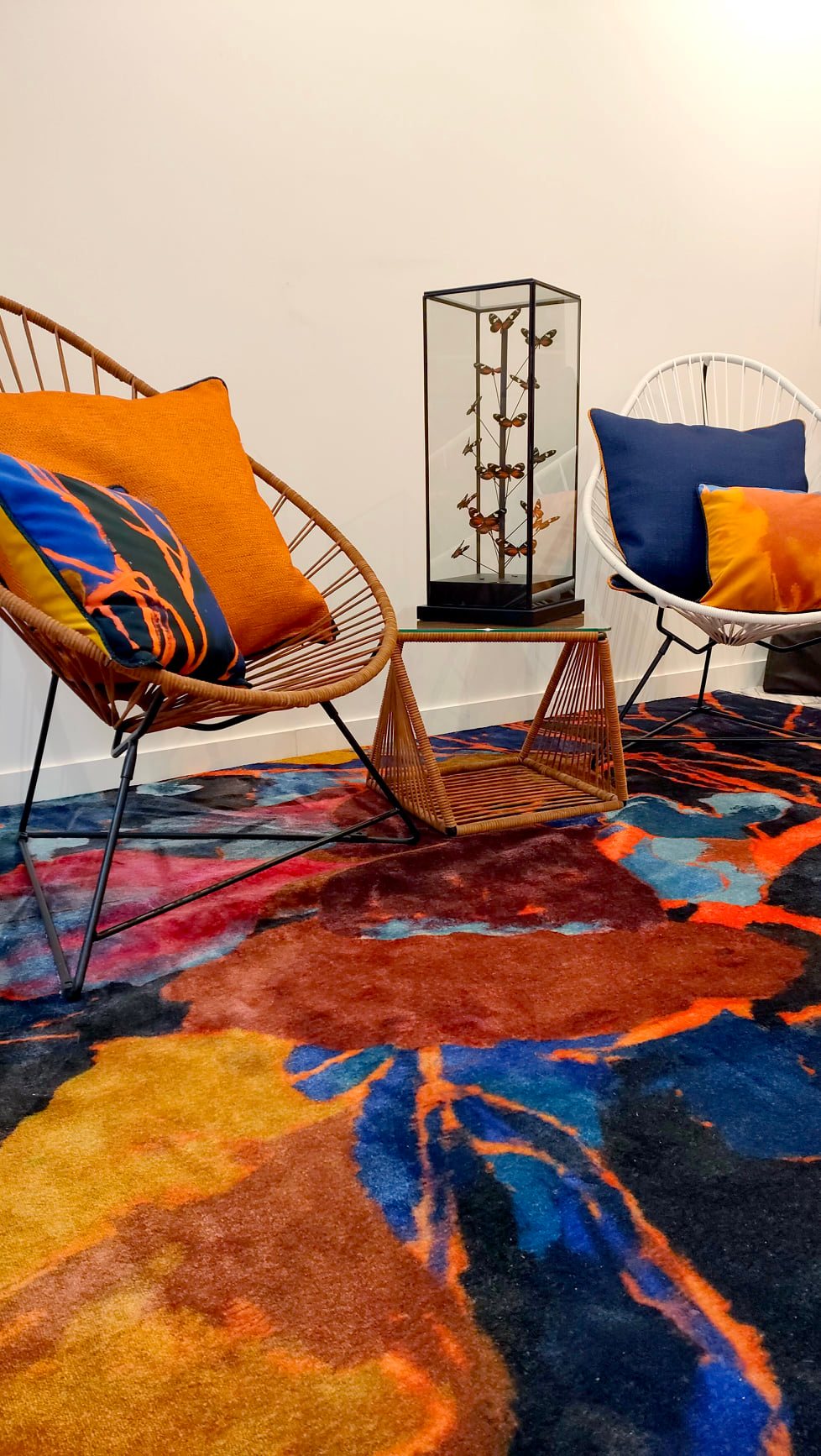 Le tapis motif Grand Gingko, réalisé à l'huile sur toile, évoque la puissance et la vitalité de la nature en automne. Ce motif captivant marie des branches vibrantes de couleur orange vif à un mélange de feuilles stylisées dans des tons riches de bleu, rouge, jaune et rose.