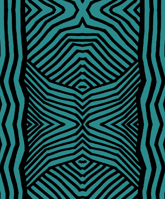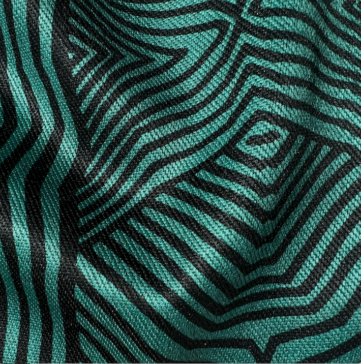 Le tissu motif Totem présente des lignes noires ondulées, presque hypnotiques, disposées de manière symétrique sur un fond bleu-vert. Ces lignes créent un effet visuel de vagues ou de vibrations donnant au design une ambiance à la fois moderne et abstraite.